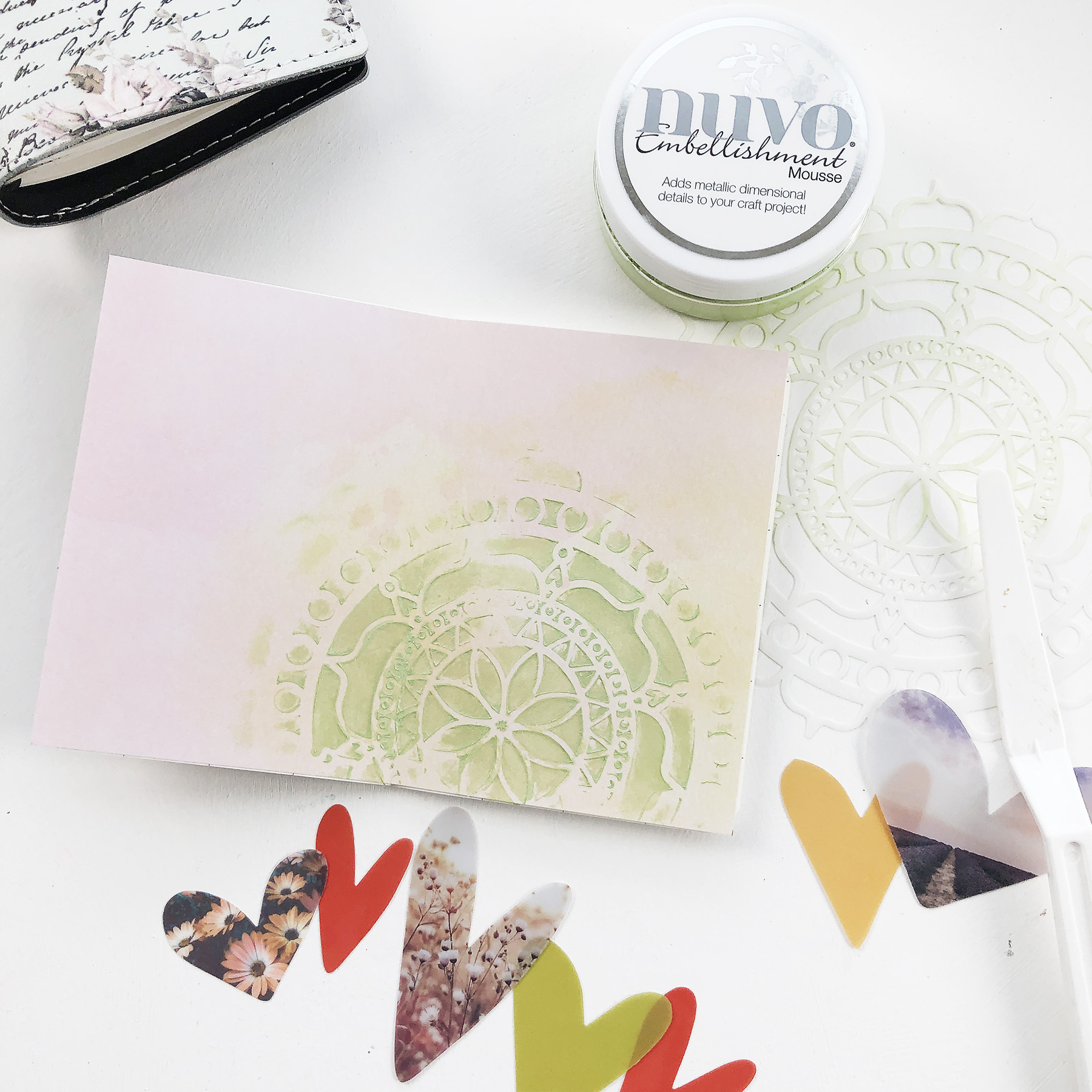 I started with the most simple supply, these transparent hearts from Studio Calico. Laying them on my new notebook told me exactly how the layout should go, don’t you just love when that happens? So I pulled a bit of patterned paper and a stencil and got started!