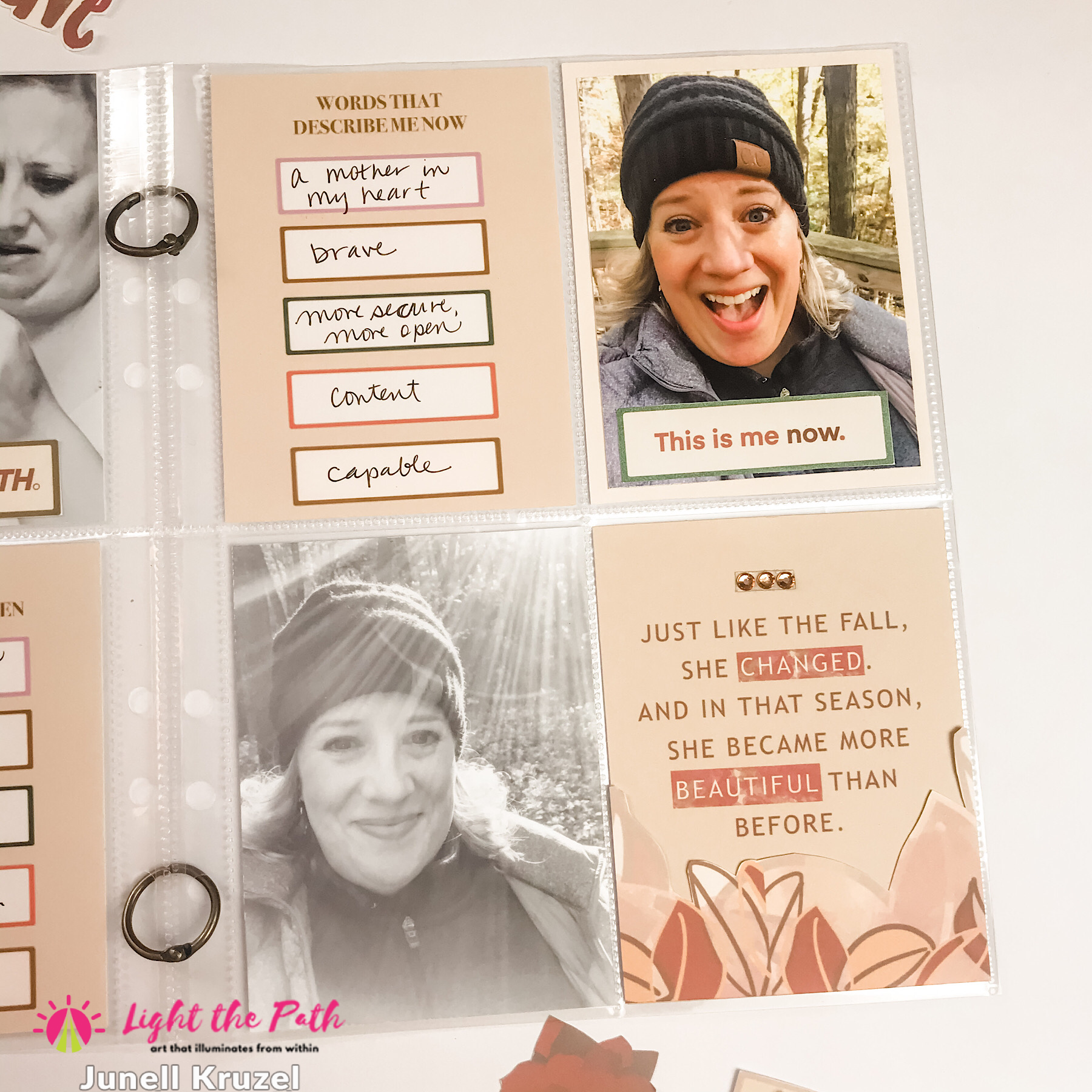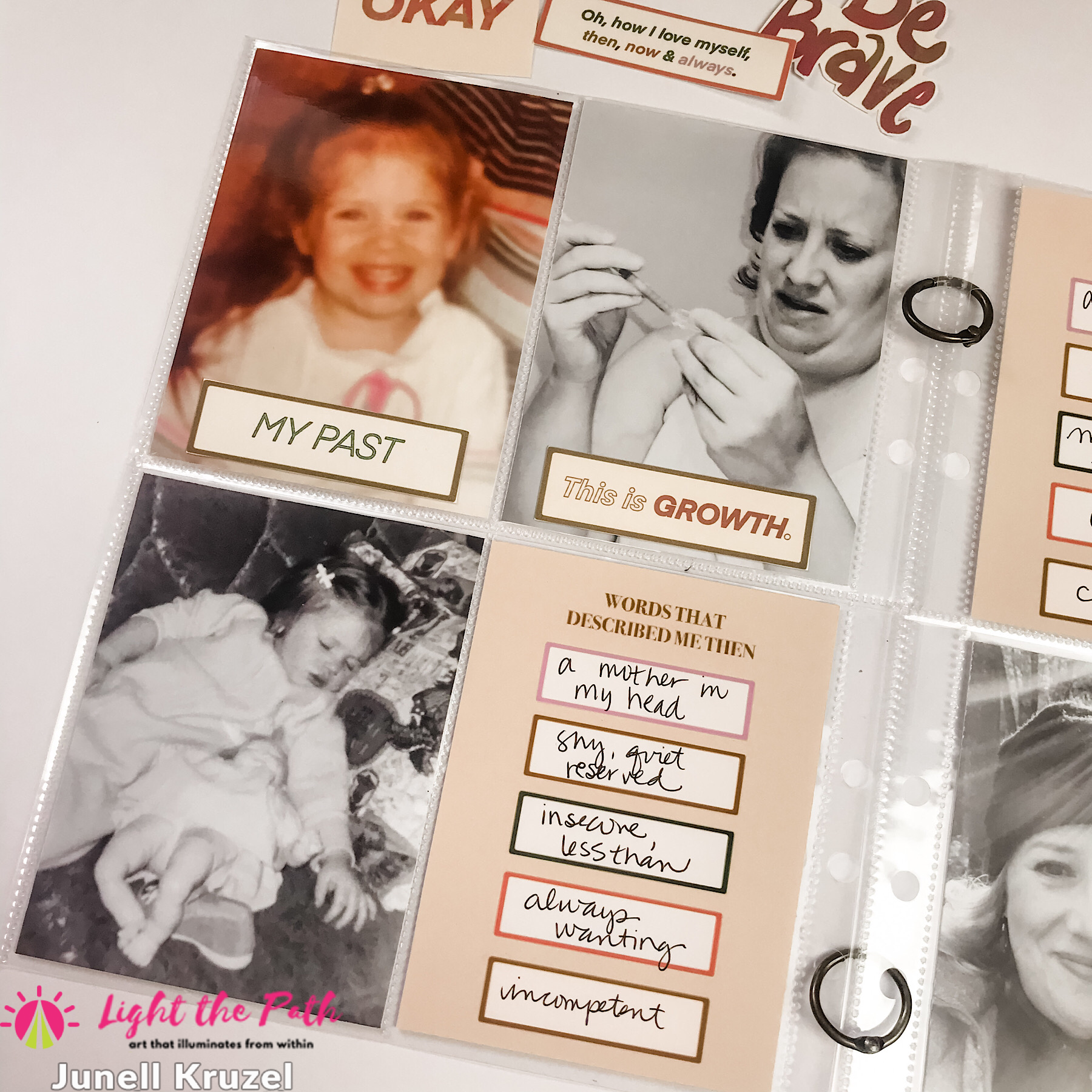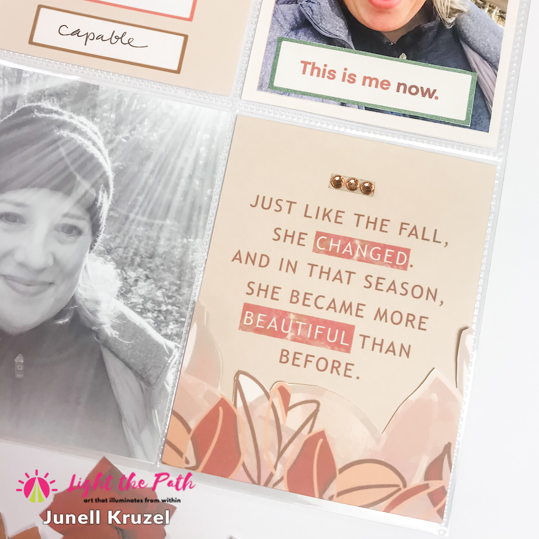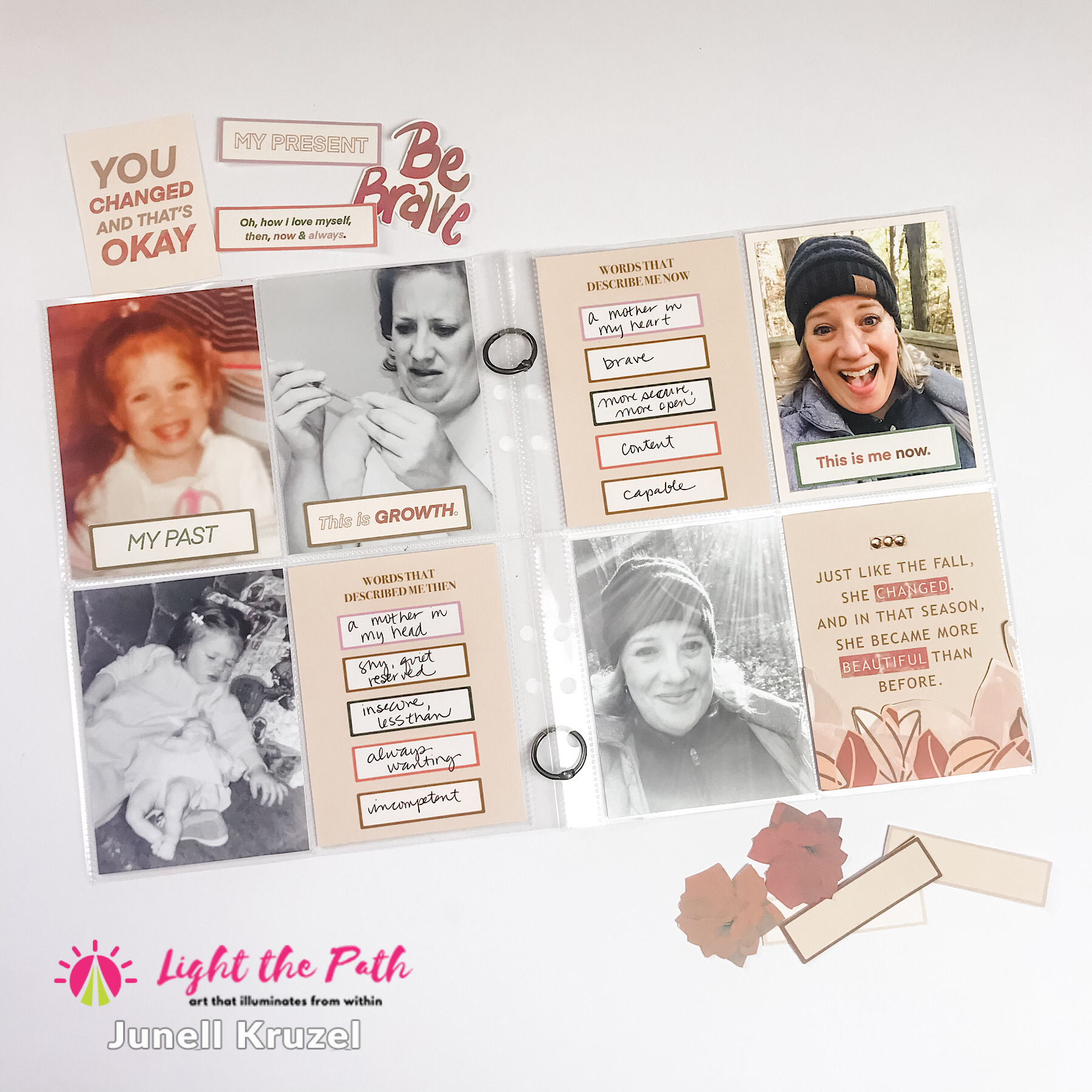 Hi everyone and welcome to a blog series created by our design team and designed to inspire you for Light The Path! This is our creative workshop that will help you document a year of healing. You can learn more about this dynamic project here: Light The Path. Today we have Junell, who will be sharing her Light The Path Introduction page from her project. You can see more of her stunning work on Instagrm: @junell.kruzell.
